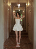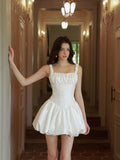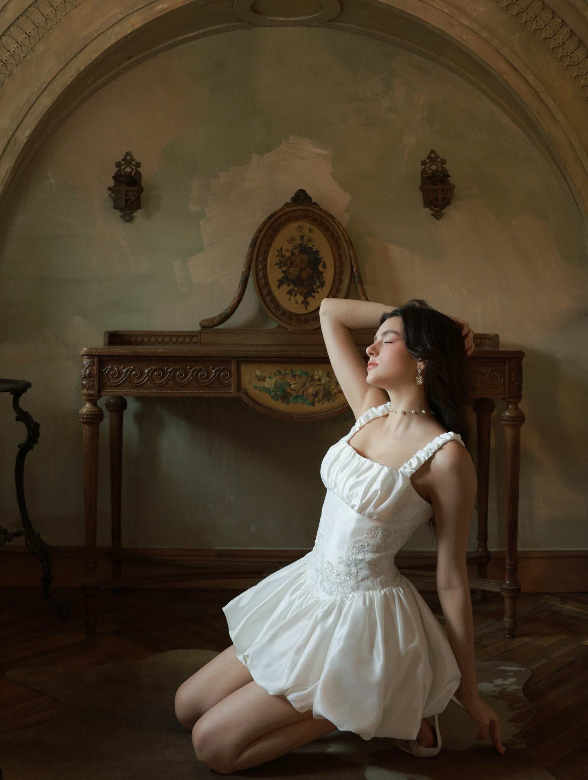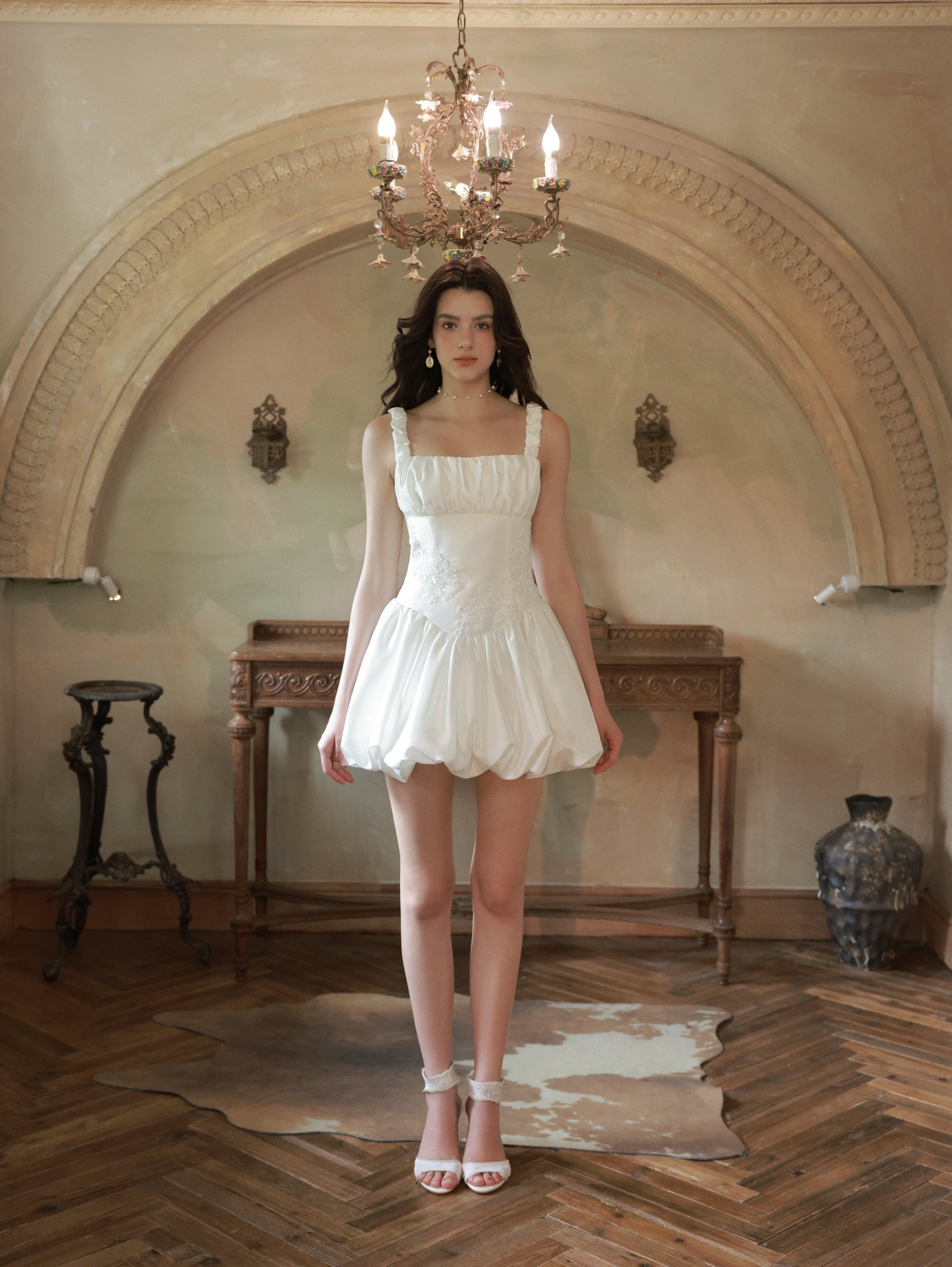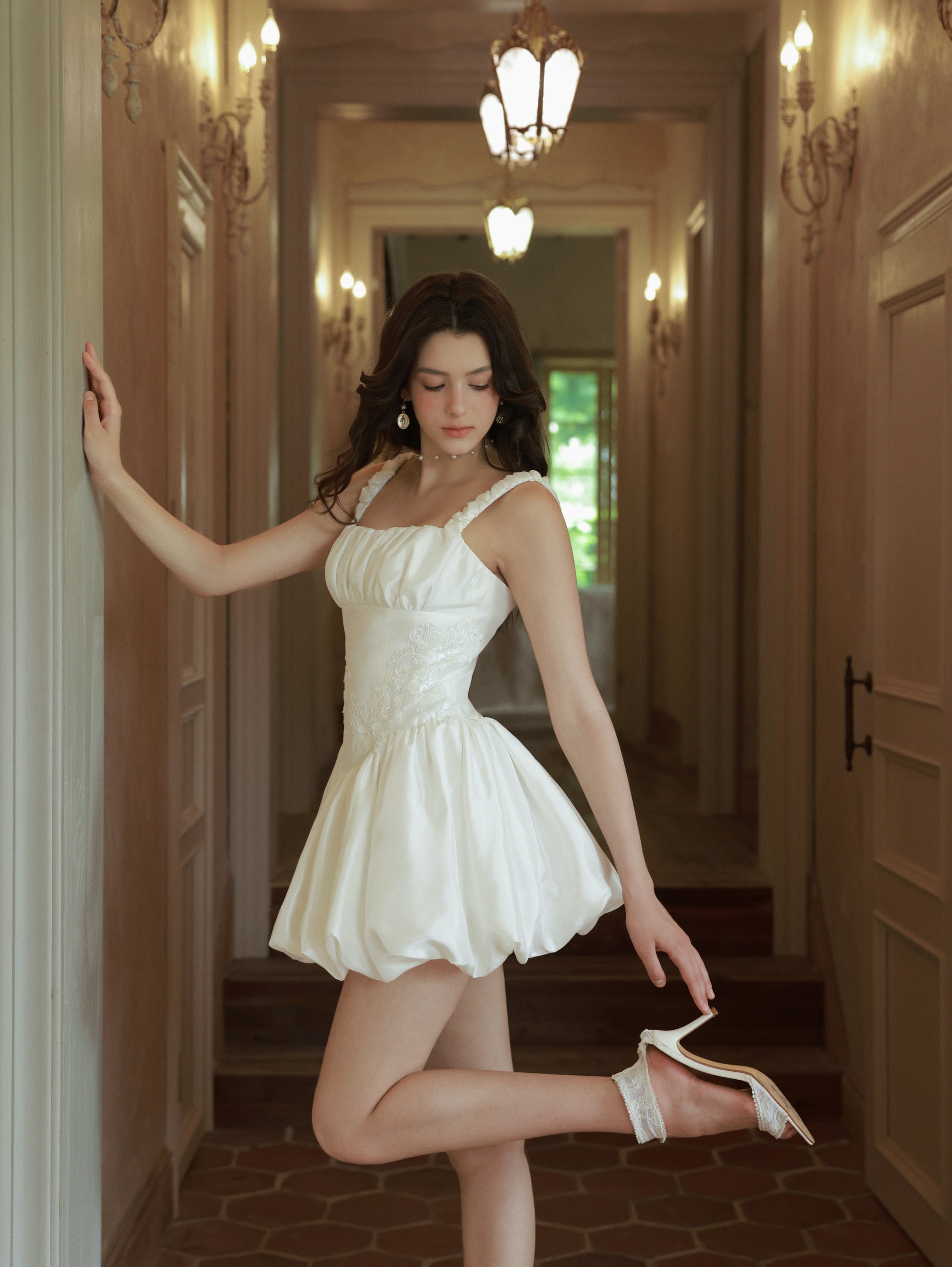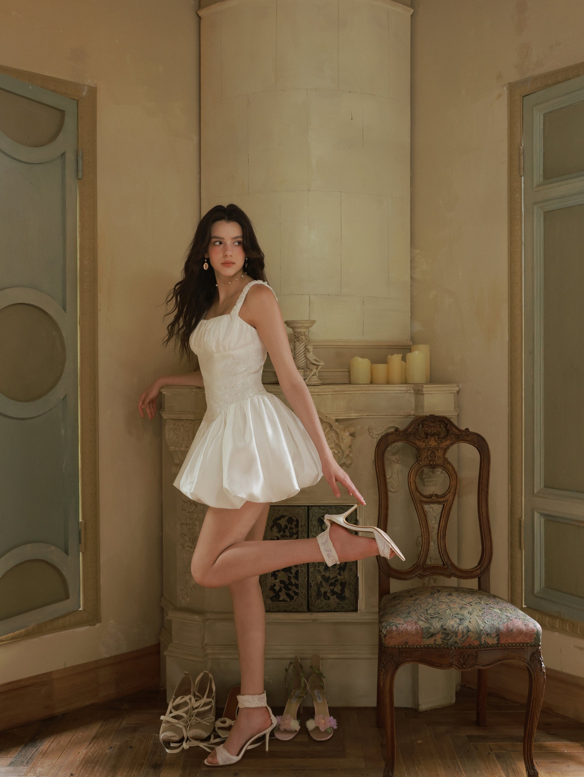 The Aireen Mini Dress: The classic square-neck spaghetti strap design blends vintage charm with sweet appeal. Delicate gathers at the shoulders and bust create rich visual texture, while the lace appliqué at the waist adds feminine refinement. The full, flared skirt blossoms like a radiant flower in full bloom.