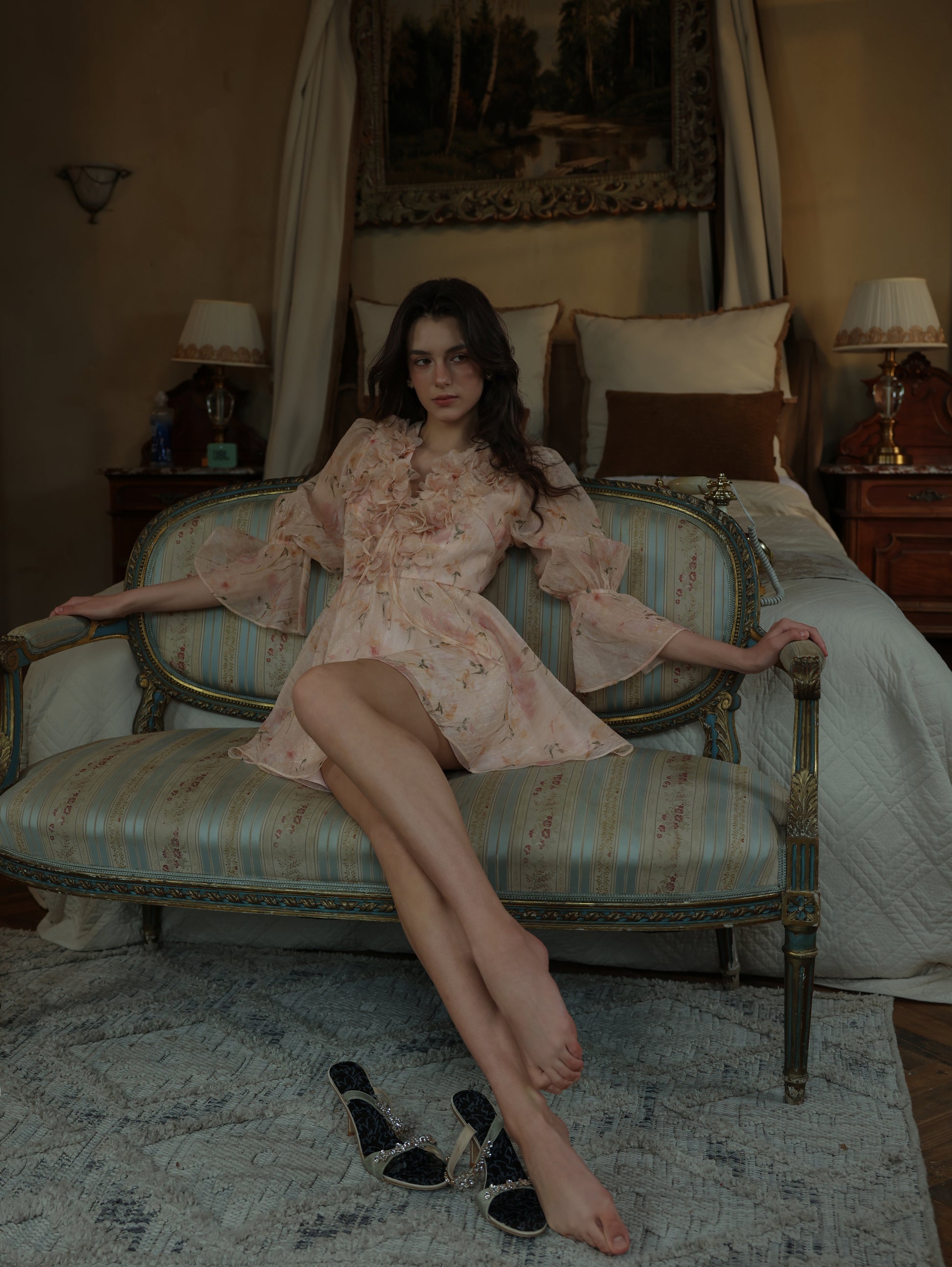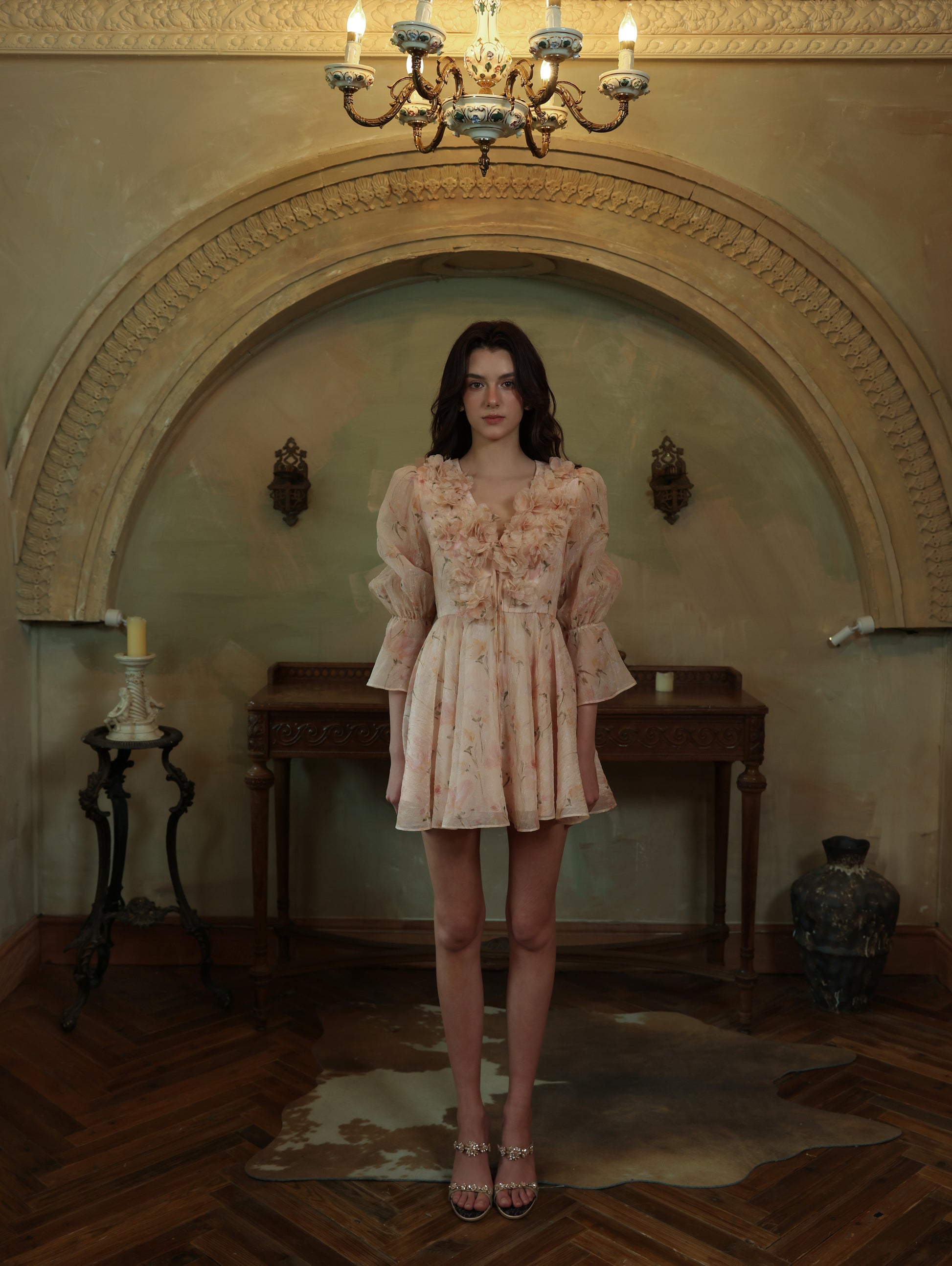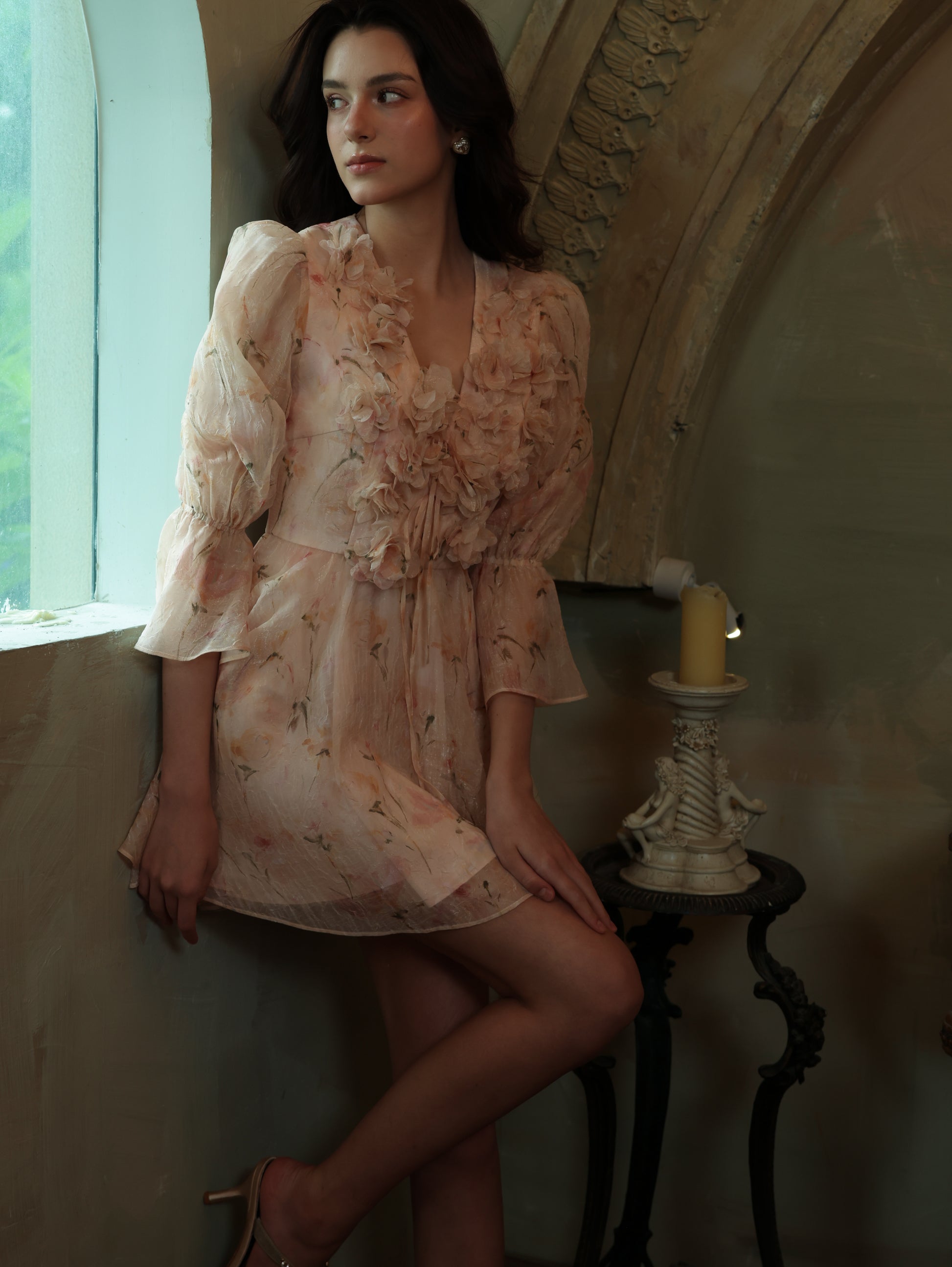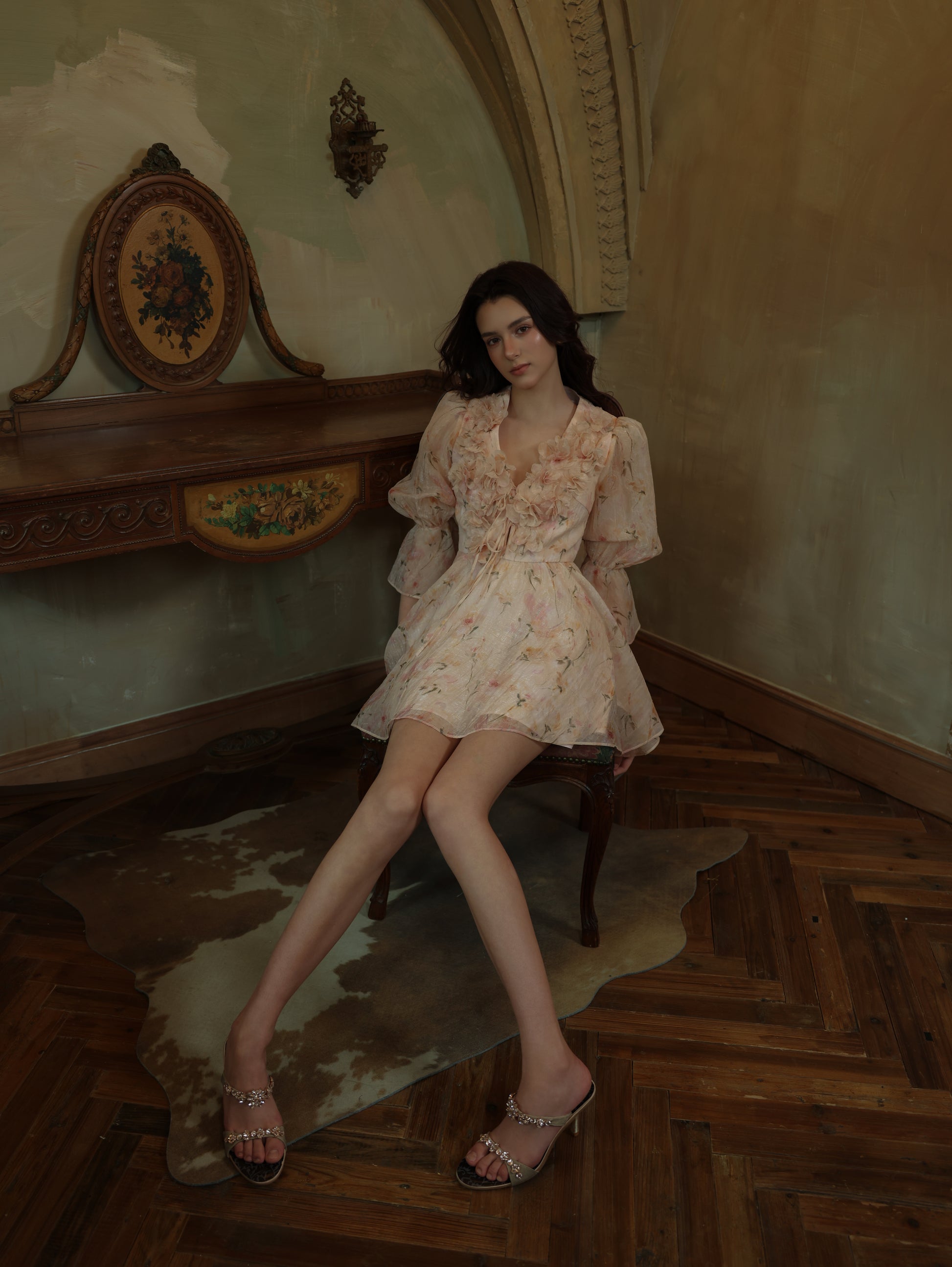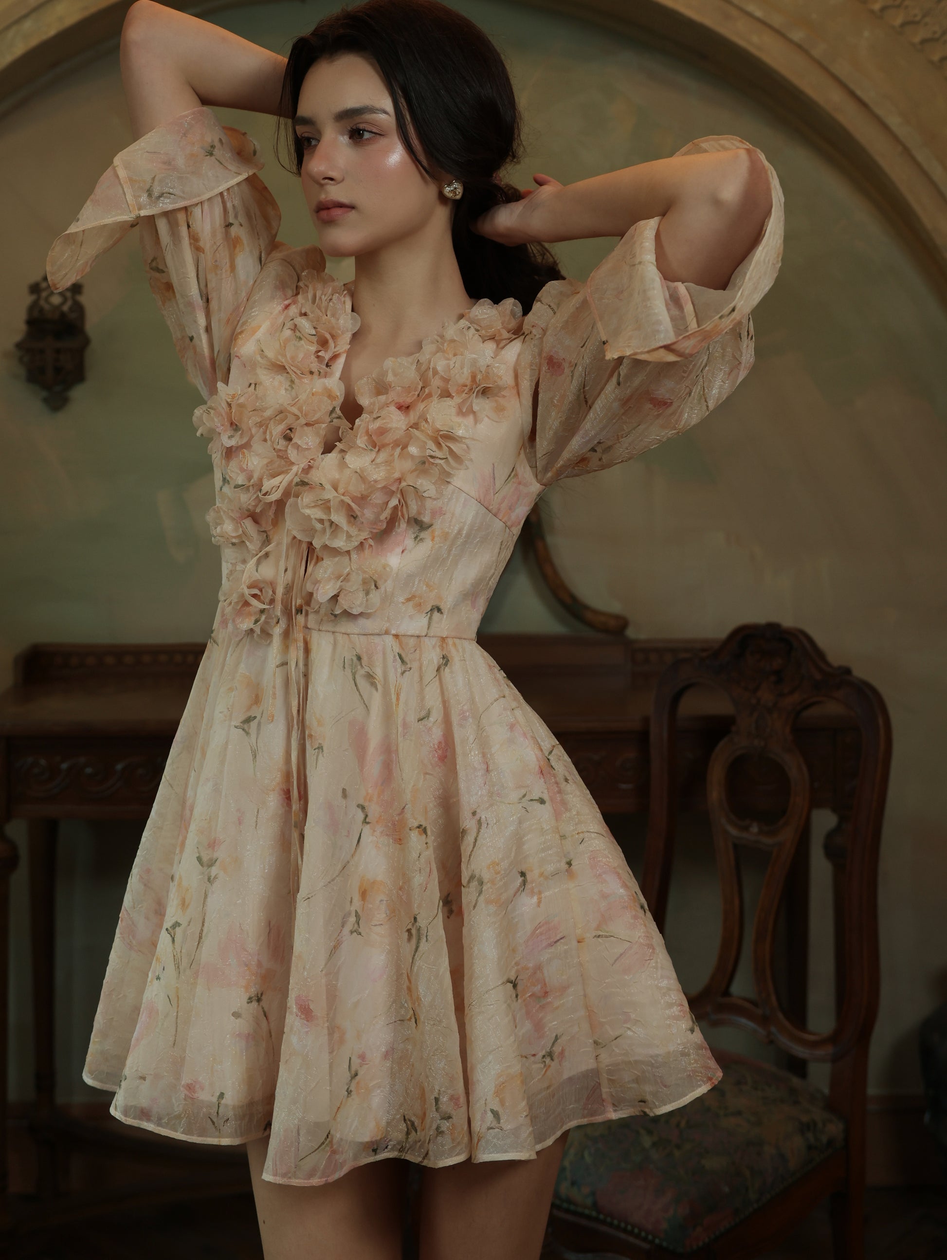 The Alaina Mini Dress: This dress is a love letter to femininity—whimsical sleeves frame the décolletage, strategic seaming elongates the form, and dimensional blooms add Baroque exuberance.