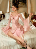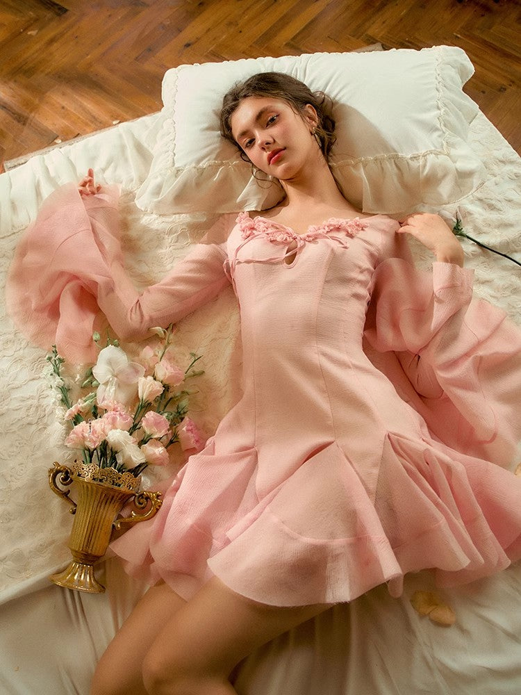 The Ariana Mini Dress: Exquisite handmade 3D florals artfully cascade along the neckline, while tiered ruffles at the hem and cuffs bloom with every movement—each step a whisper of elegance.
