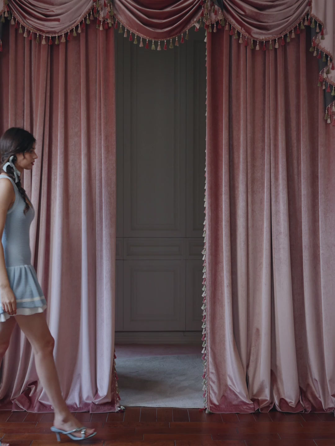 The Delanie Mini Dress: The delicate blend of powder blue and white evokes the crisp freshness of summer breeze. Woven with cotton-blended yarns, this airy fabric embraces your skin in cloud-like softness—keeping you cool and comfortable even on the hottest days.