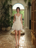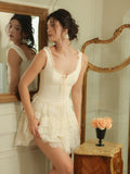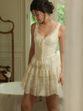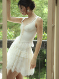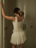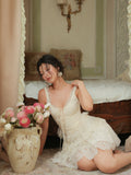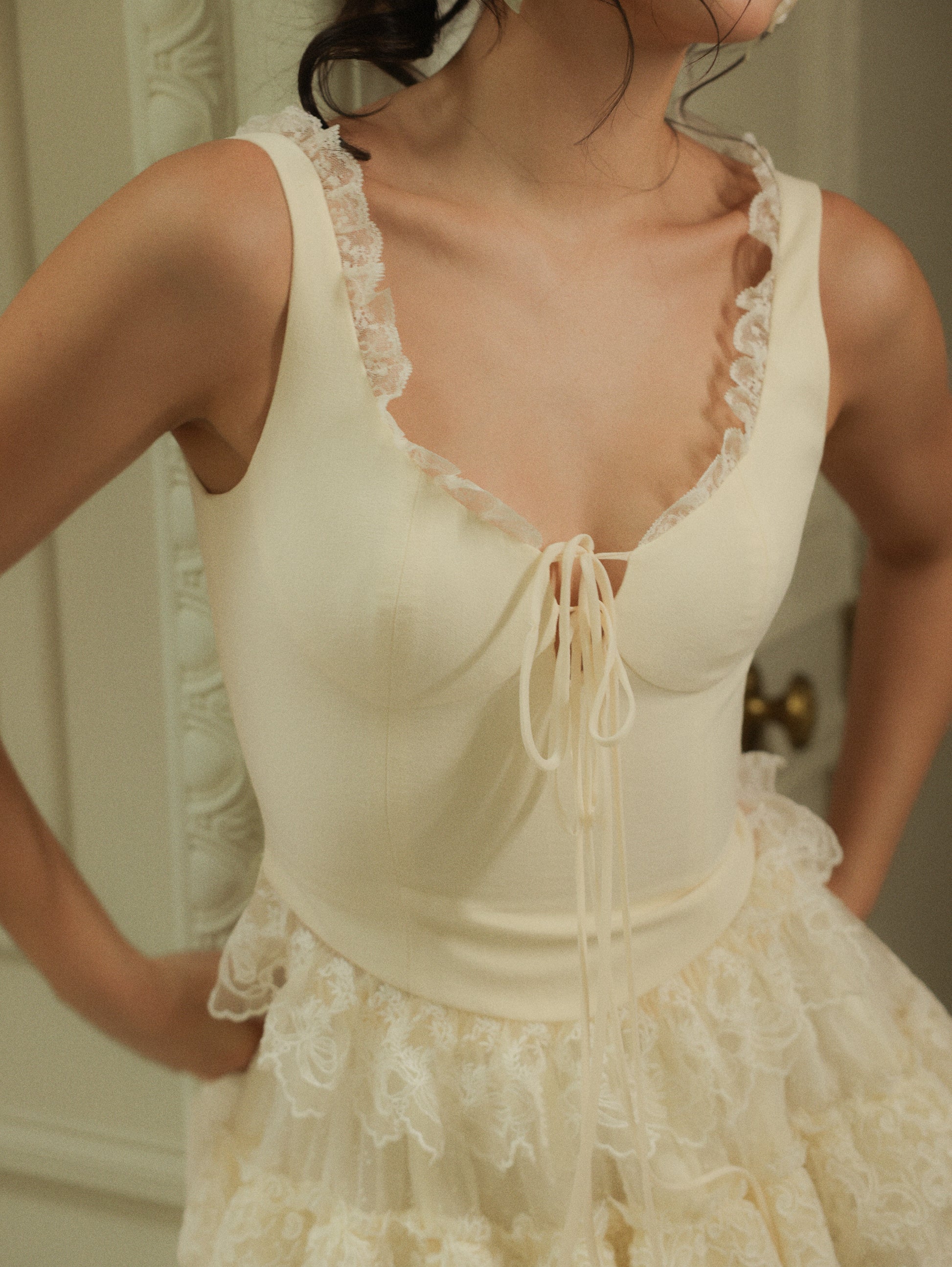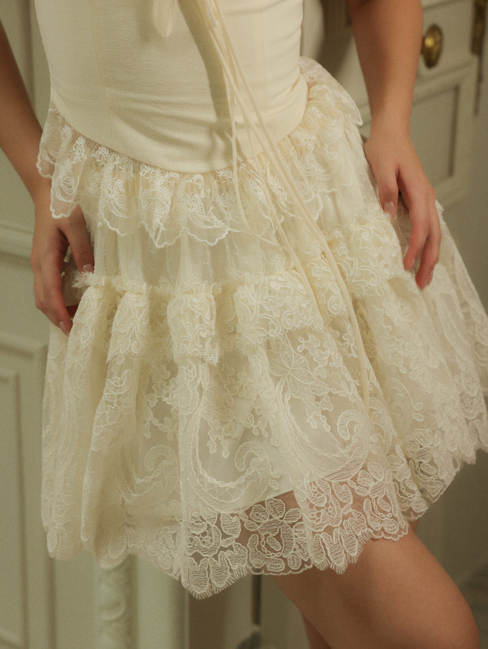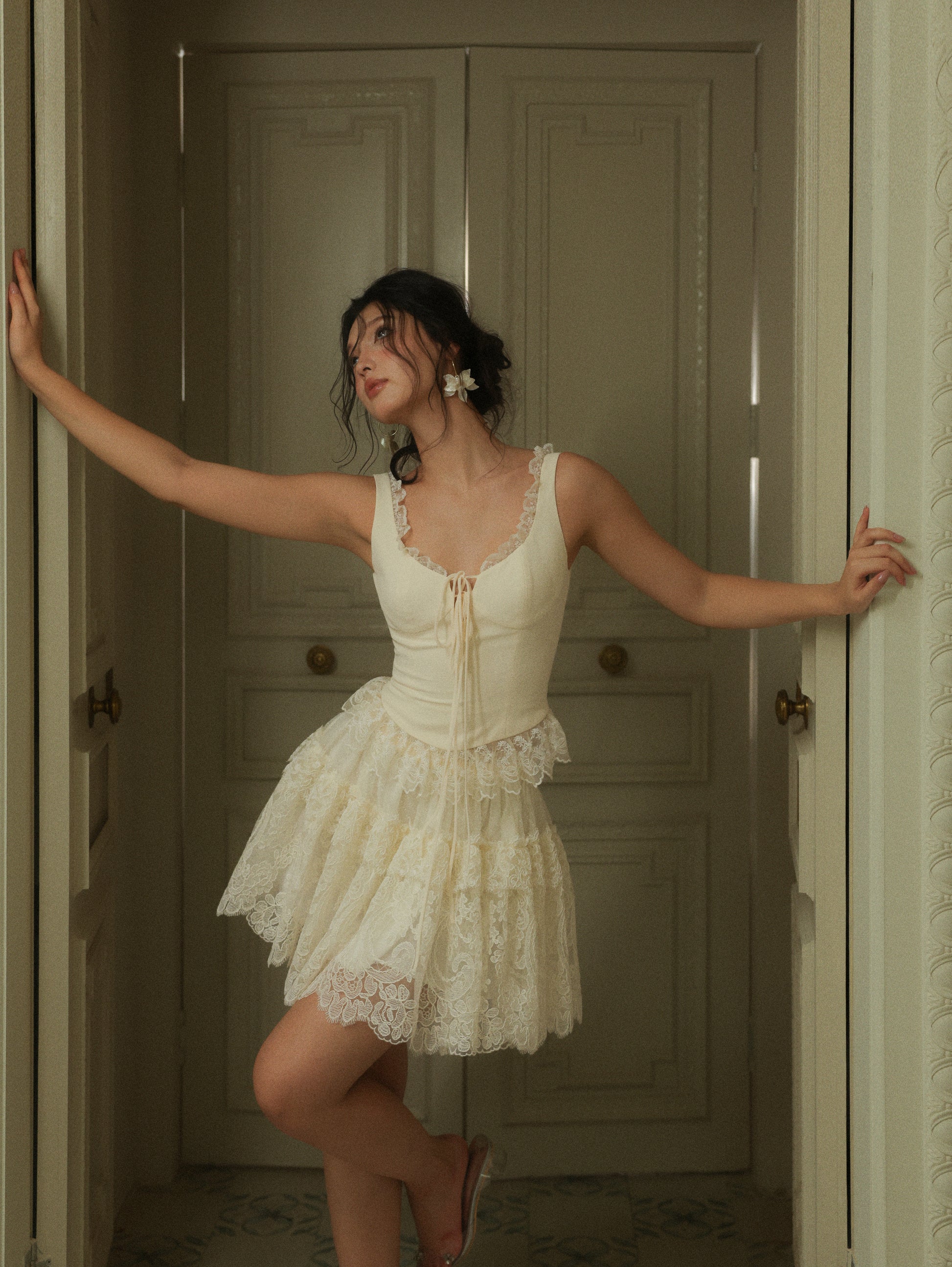 The Emmeline Set: V-neckline adorned with lace trims accentuates feminine grace, while the high-waisted lace skirt boasts a naturally structured volume, light and ethereal, like a ballet dancer’s tutu.