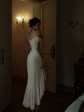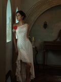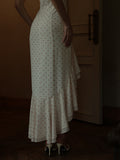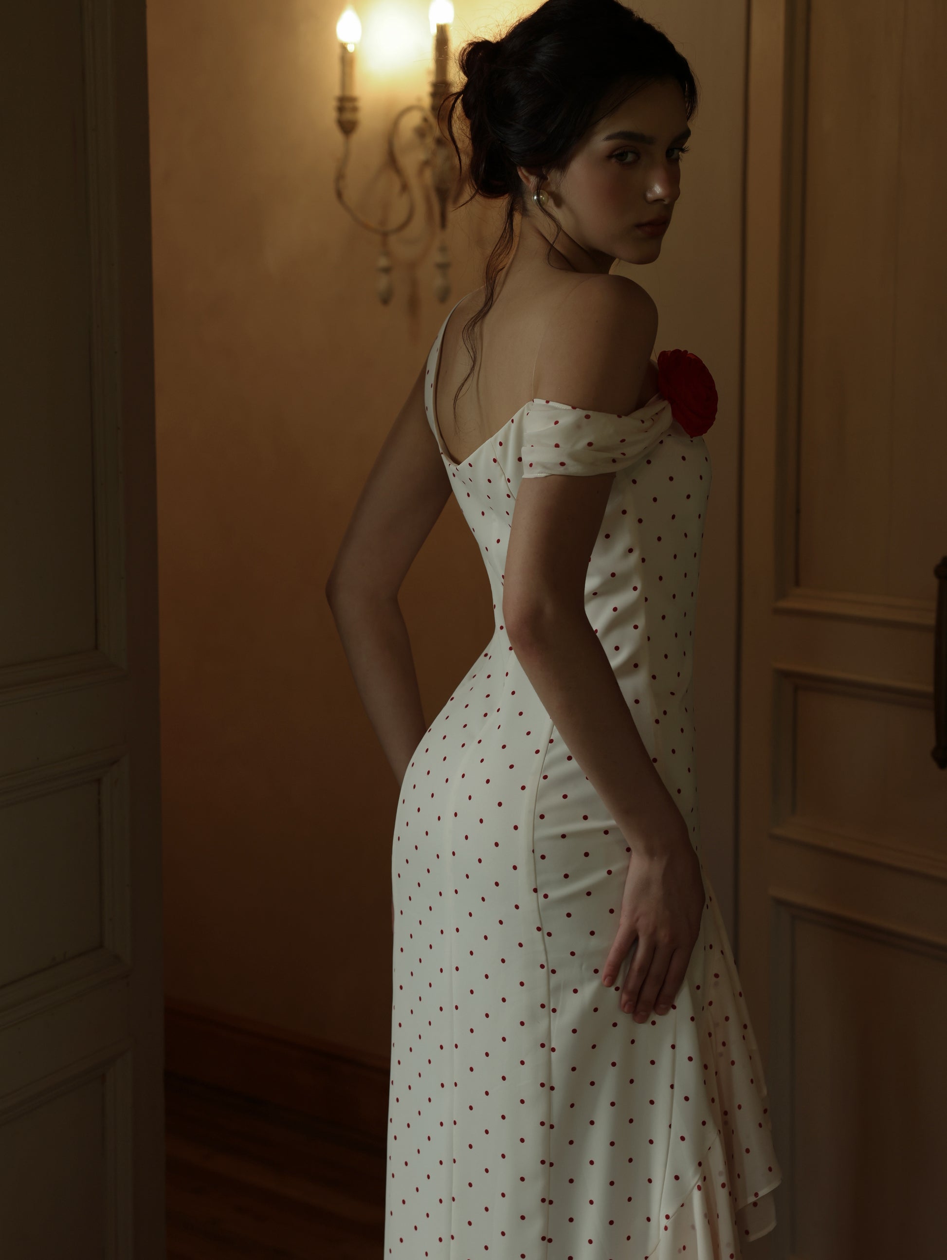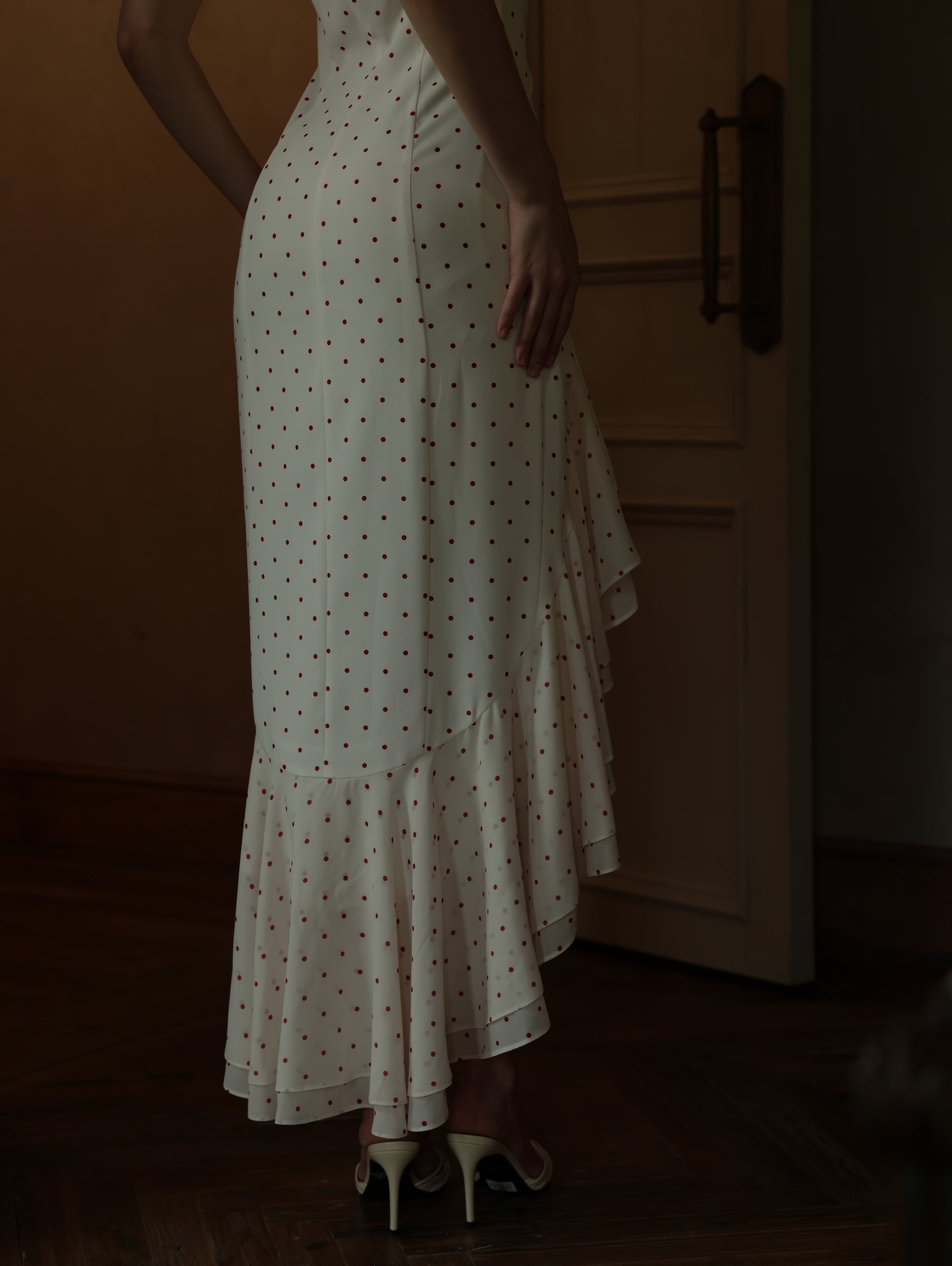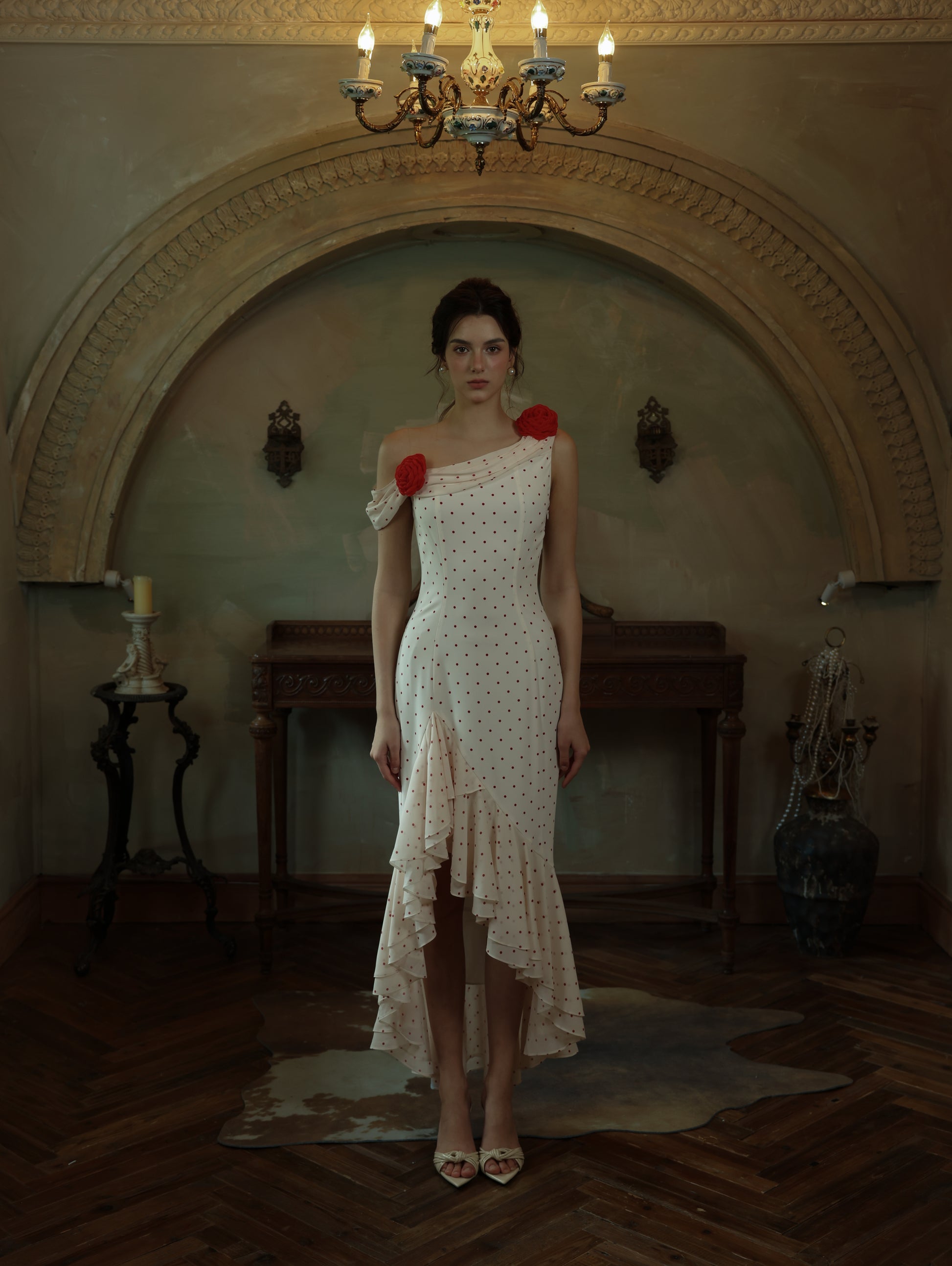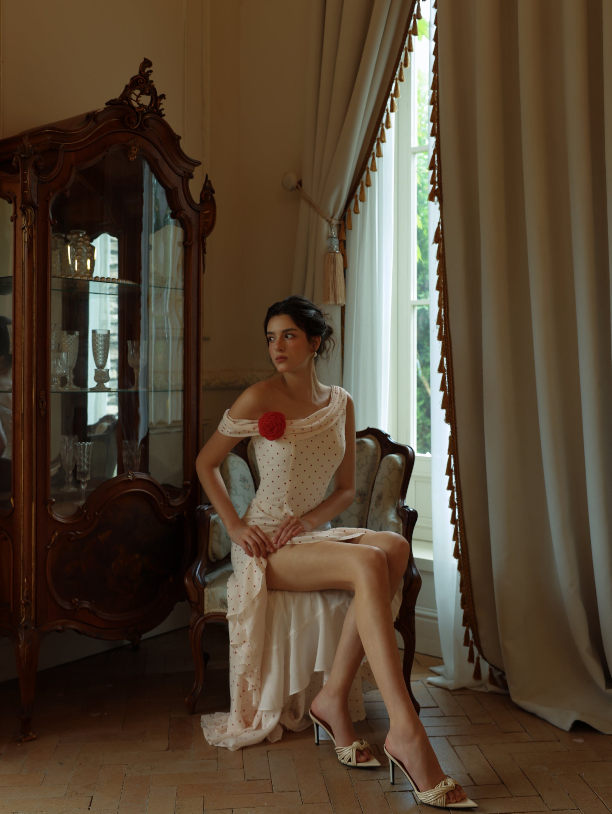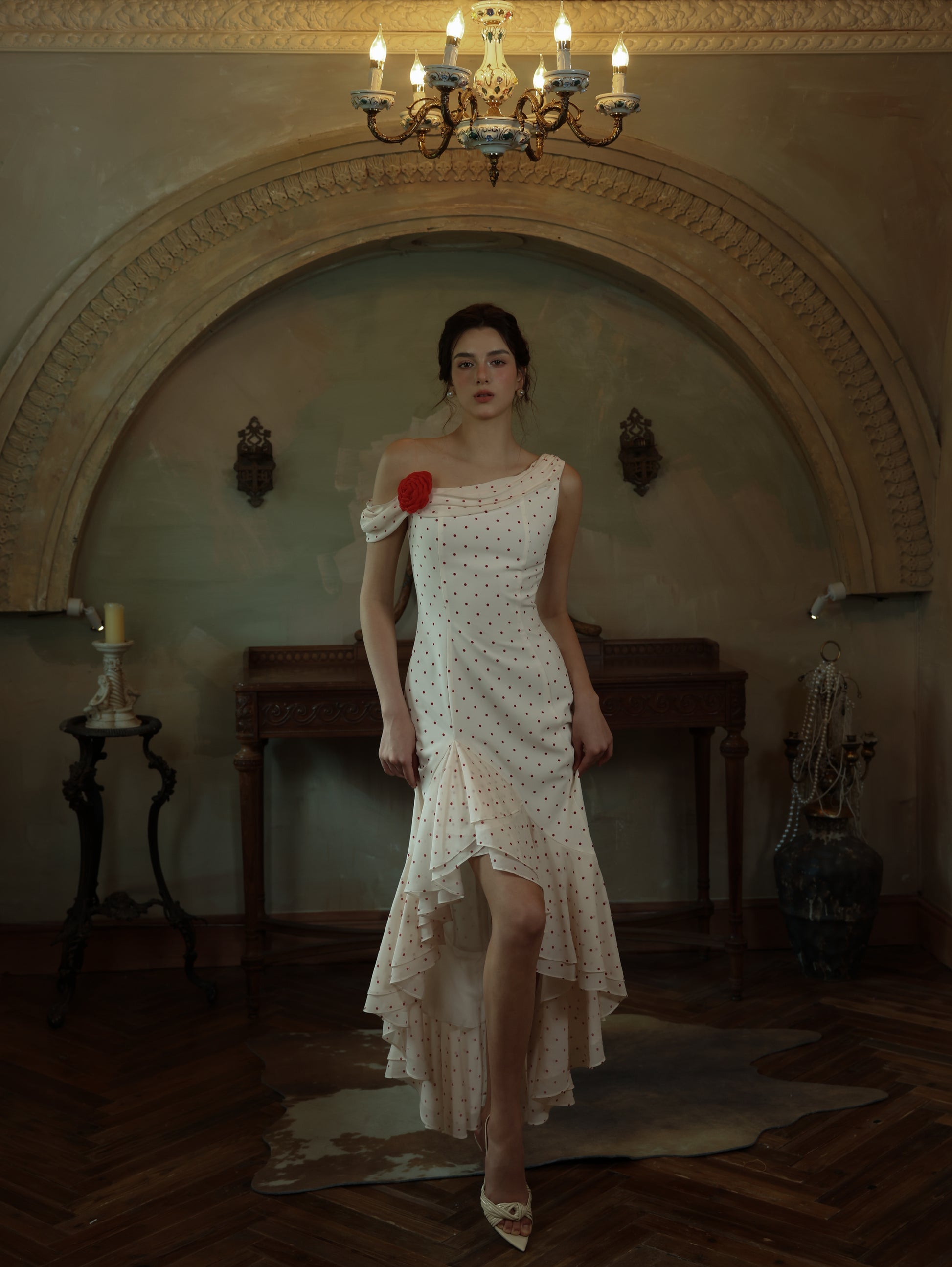 The Everly Midi Dress: Romantic red polka dots dance with asymmetrical flounced hemlines, channeling old Hollywood glamour. Featuring two detachable 3D floral pins, this dress transforms any getaway look into a playful style adventure.