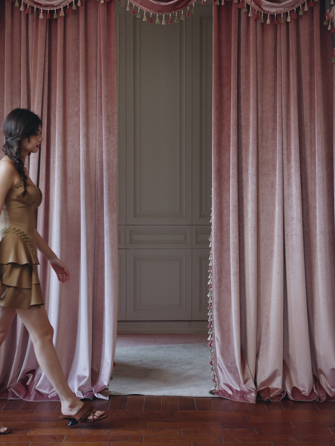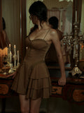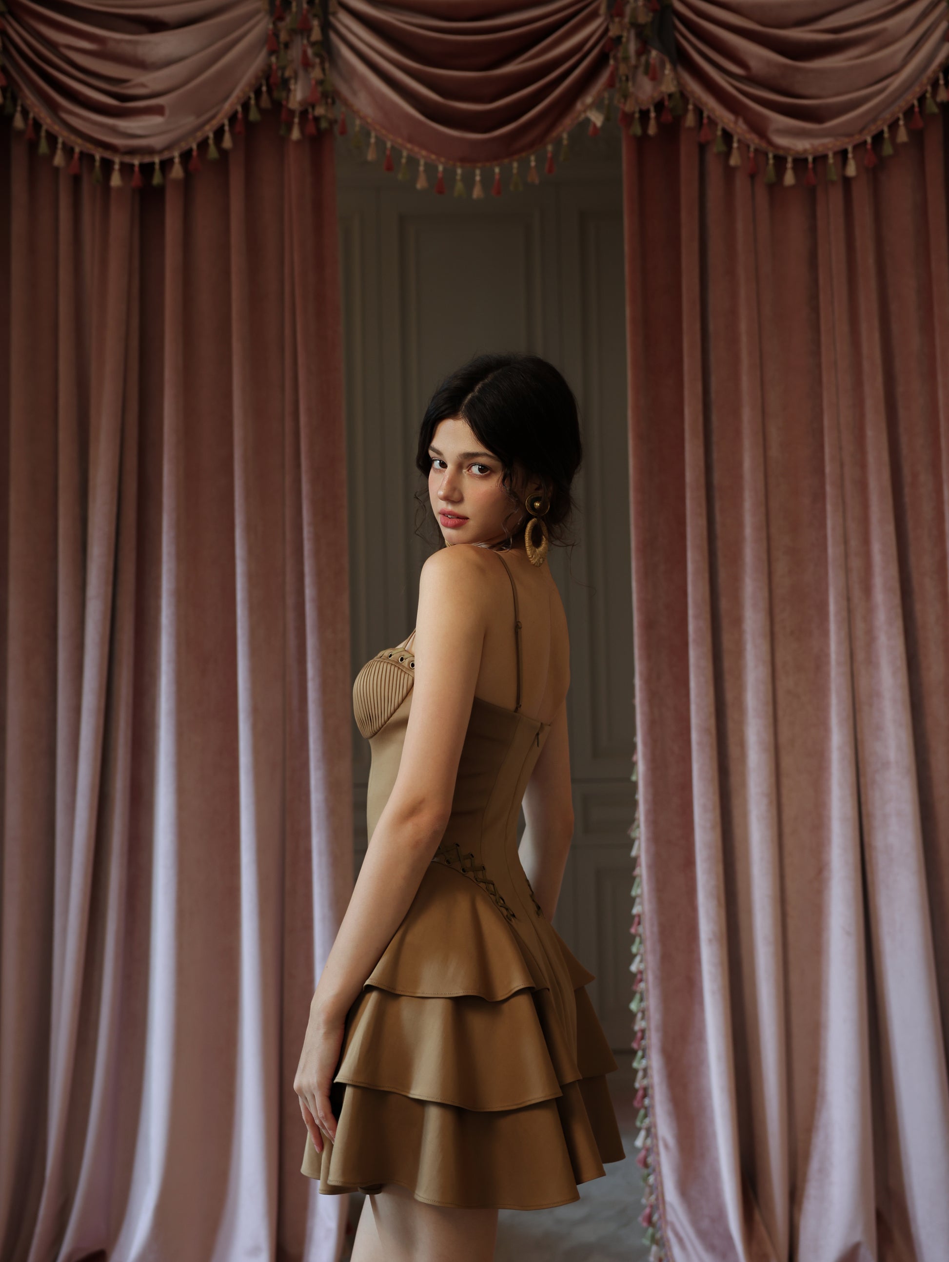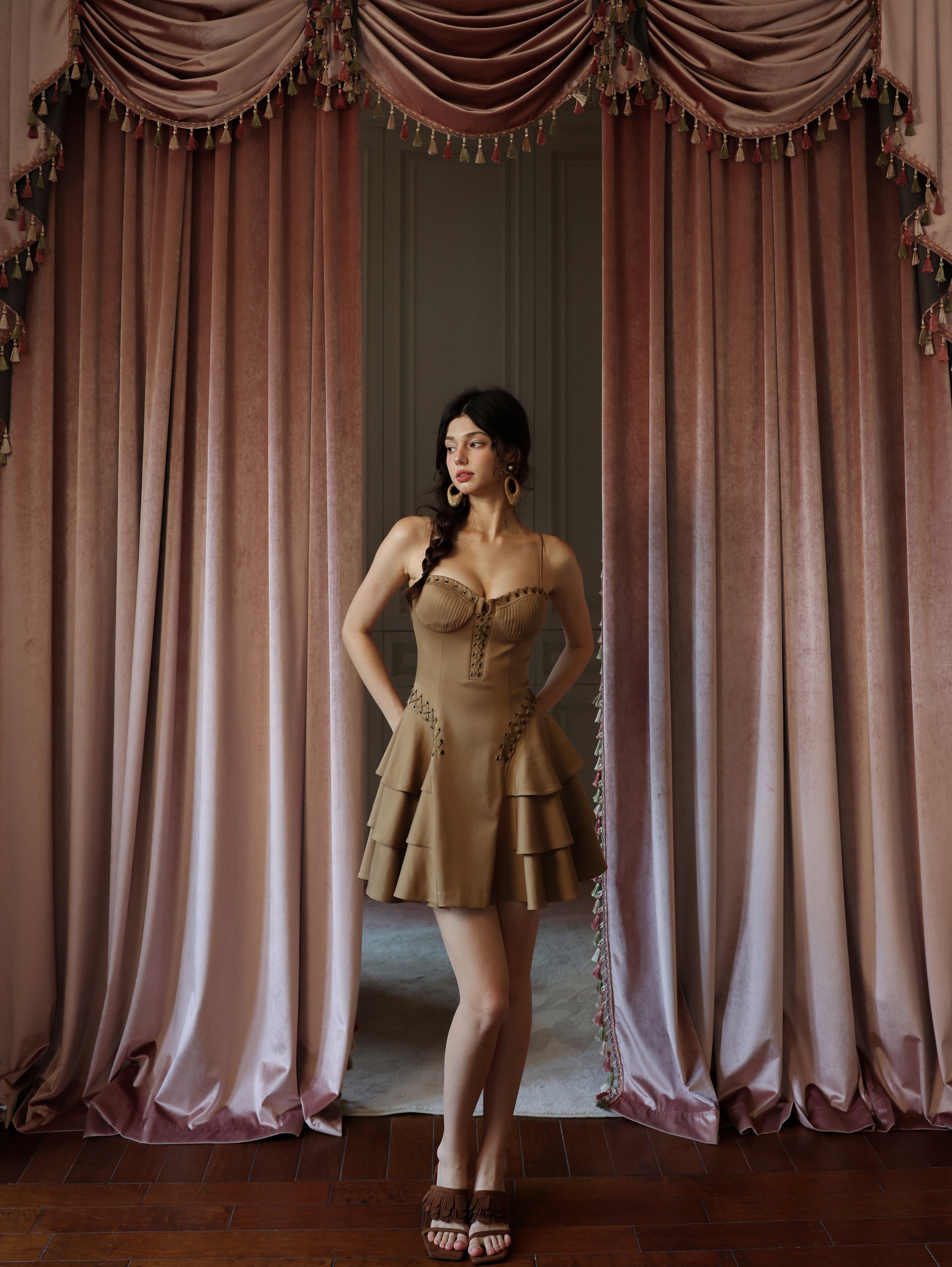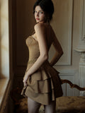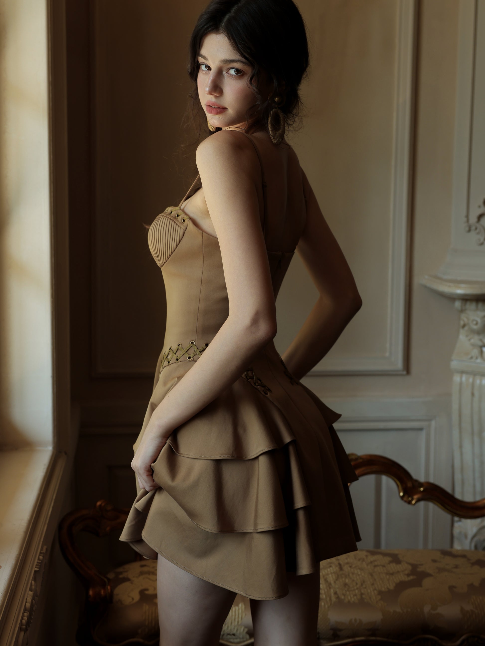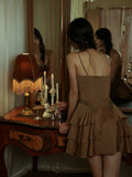 The Georgina Mini Dress: The espresso-hued mini slip dress exudes untamed allure with metallic stud embellishments, while the corset-inspired waistline sculpts a razor-sharp silhouette. Its velvety suede touch adds a tactile dimension of luxury—like crushed velvet kissed by moonlight.