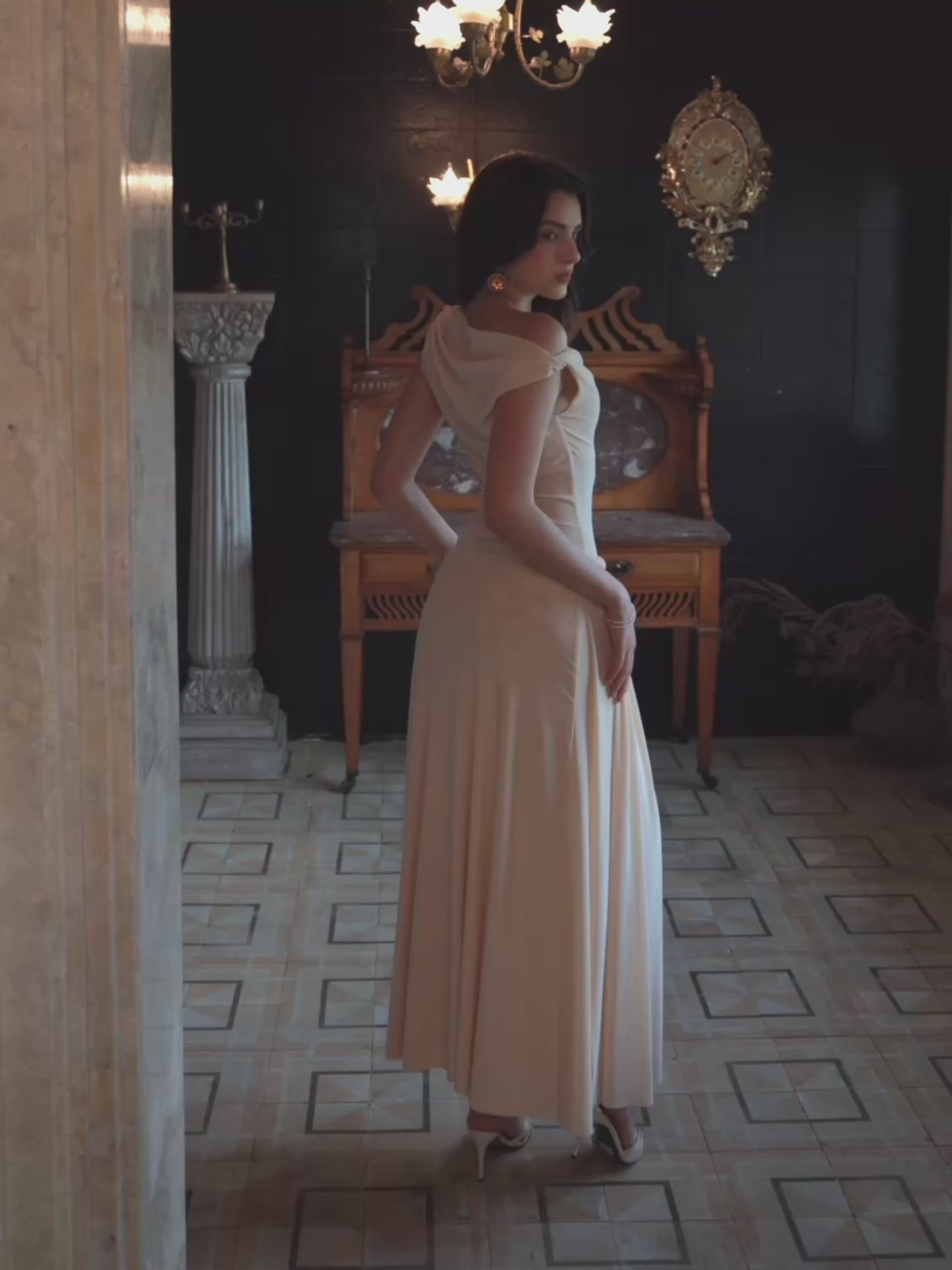 The Gwyneth Midi Dress: The asymmetric shoulder cut elegantly frames the neckline, while the crisscross waist detailing accentuates a slender silhouette. Made from ultra-soft mesh fabric, the dress drapes like a cloud with featherlight grace against the skin.