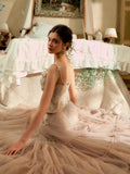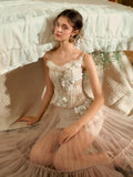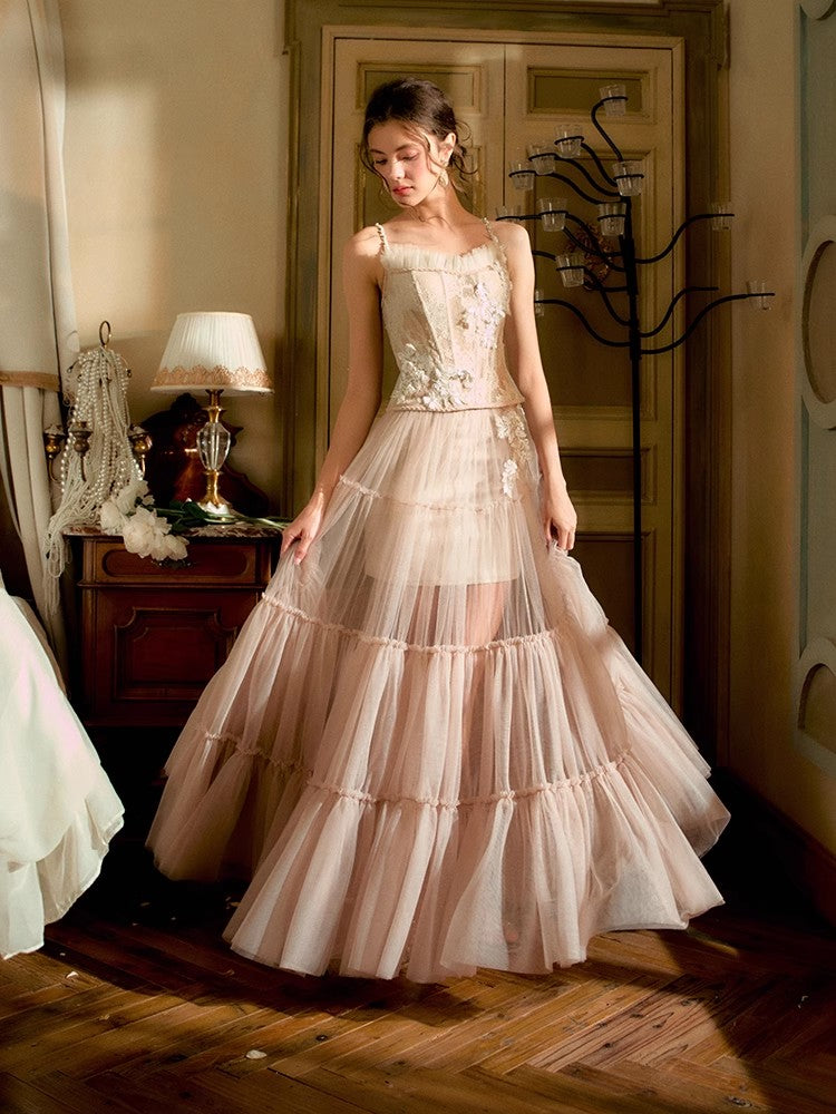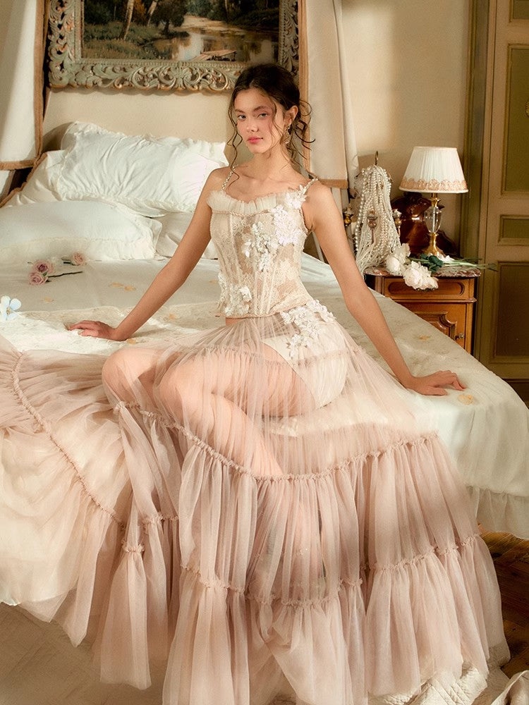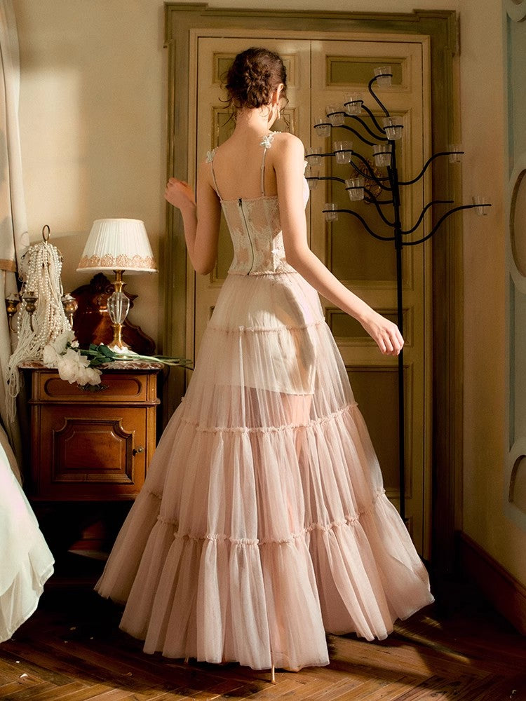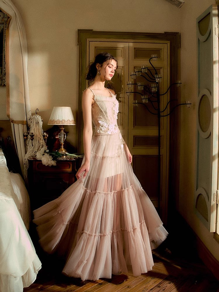 The Violetta Maxi Dress: Gold-thread jacquard rose lace fabric – the intricately woven metallic strands create a uniquely vintage texture, while the slightly elastic yarn flatters your curves without constriction.