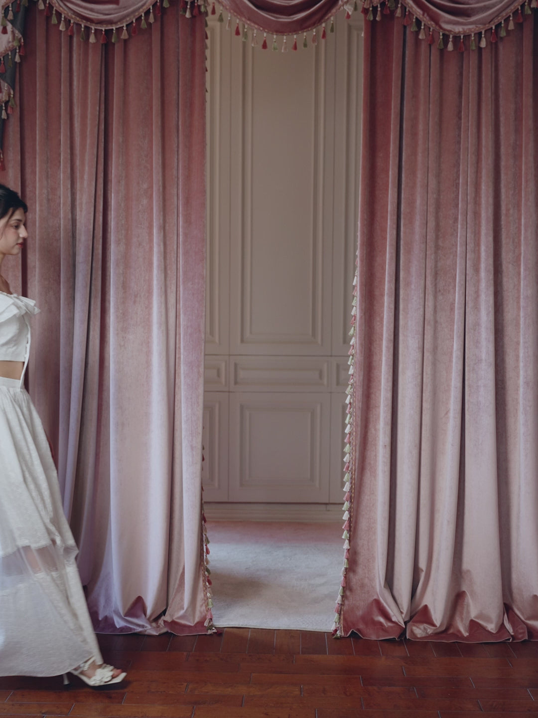 The Jenesis Set: This convertible puff-sleeve top—wear it as a sweetheart or V-neck—pairs perfectly with the high-waisted skirt to elongate your silhouette. A satin bow adds playful charm, while the hem’s semi-sheer lace insets offer glimpses of skin, creating an ethereal flutter with every step.