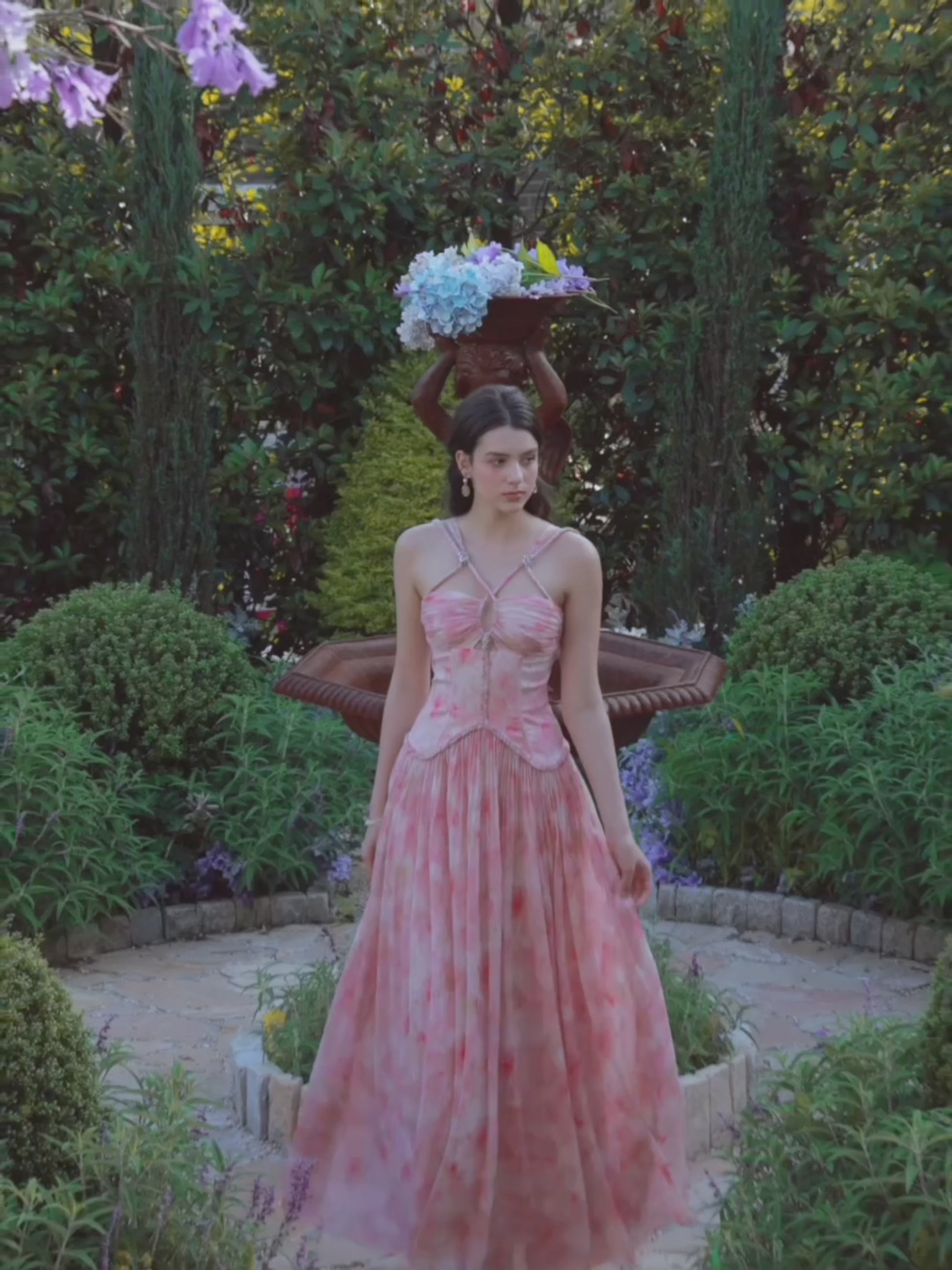 The Josephine Maxi Dress: The combination of spaghetti straps and crisscross ties, accented with custom metal details, creates a look that's both sensual and powerful. The pink printed skirt dances with the wind like a blossoming spring meadow.